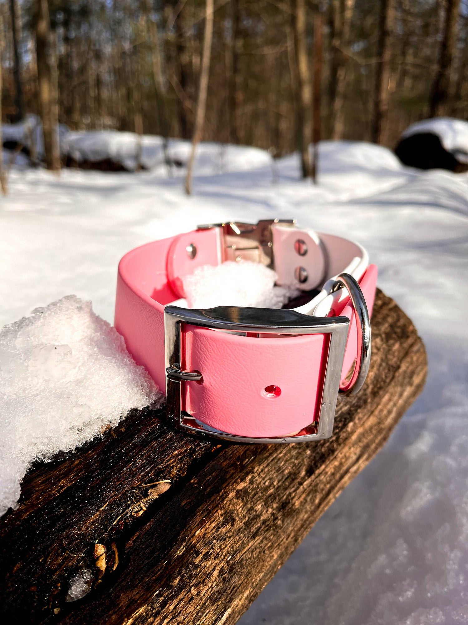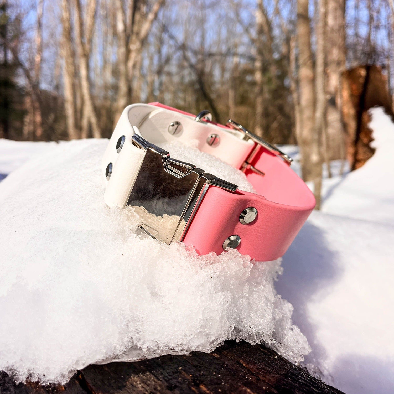 This product is made with a vegan leather alternative called Biothane. Our Biothane is made in the USA and is waterproof and stink proof. The Biothane has a soft coating that has the look and feel of leather without harming any animals. It is matte in appearance and will hold its flexibility at extremely low temperatures.