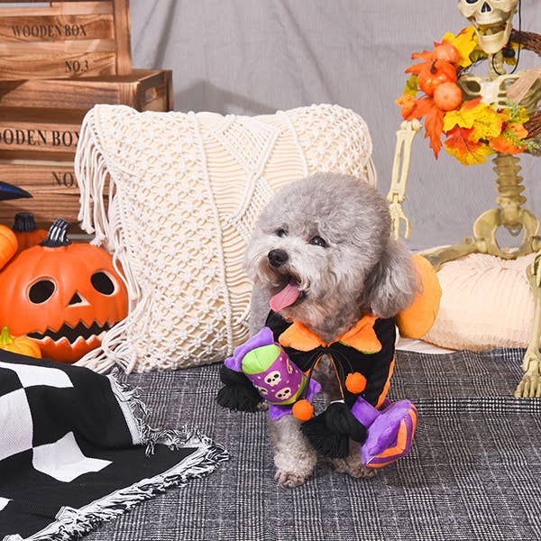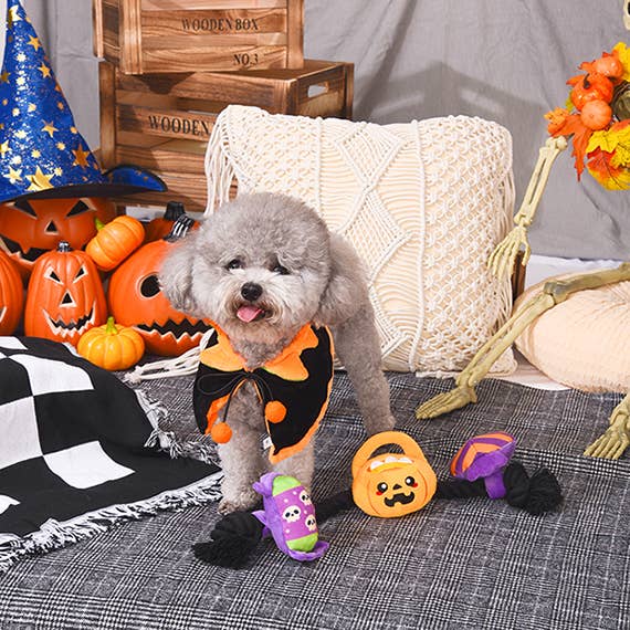 Trick-or-treat with our Howloween Candy dog toy! This toy features a candy basket and two candy toys on a sturdy rope, perfect for keeping your dog entertained. Each candy toy crinkles for added excitement, and there's a squeaker inside each one for satisfying sounds. Whether your dog enjoys tugging, fetching, or interactive play, this spooktacular rope toy is sure to be a howling hit during the Halloween season!