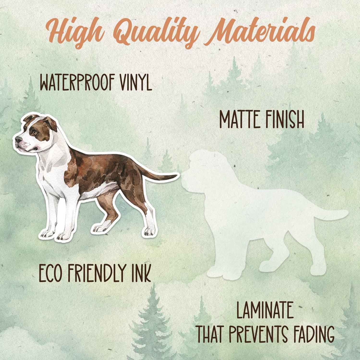 This die cut staffie terrier dog sticker measures 3 x 2.4 inches and has a matte finish.